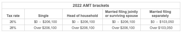Like the regular tax brackets, the AMT brackets are annually indexed for inflation. For 2022, the threshold for the 28% bracket increased by $6,200 for all filing statuses except married filing separately, which increased by half that amount.