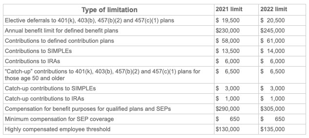 Not all of the retirement-plan-related limits increase for 2022. Thus, depending on the type of plan you have, you may have limited opportunities to increase your retirement savings if you’ve already been contributing the maximum amount allowed:
