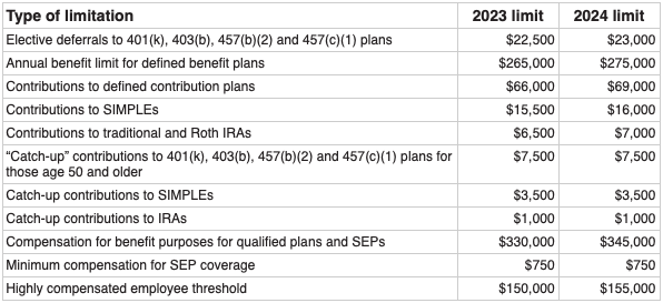 Nearly all retirement-plan-related limits will increase for 2024. Thus, depending on the type of plan you have, you may have limited opportunities to increase your retirement savings if you’ve already been contributing the maximum amount allowed: