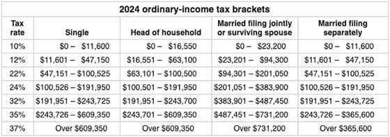 Tax-bracket thresholds increase for each filing status but, because they’re based on percentages, they increase more significantly for the higher brackets. For example, the top of the 10% bracket will increase by $600–$1,200, depending on filing status, but the top of the 35% bracket will increase by $18,725–$37,450, again depending on filing status.